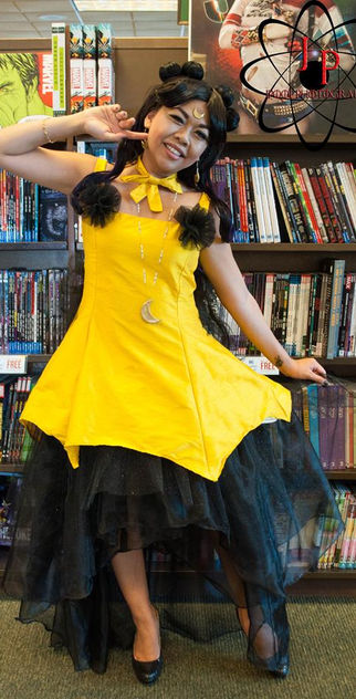 Construction: I wanted quality materials, so I picked this silk, but it didn't lay as nicely as I'd hoped. I made this in two pieces- a dress and an underskirt. The underskirt consists of yards upon yards of black organza and black glitter tulle. Can you believe that I feel like it could use more? Unfortunately, the glitter shed everywhere, making cleanup a nightmare. I handmade the jewelry, making all the moon pieces out of clay. The wig is made of two wigs - both purchased on Amazon. I deconstructed a purple wig and sewed wefts of it into the black one. Sadly, the purple fibers were lower quality than the black and they tangle quite badly. I made the odangos but cutting holes in the middle styrofoam balls and feeding black wefts through. I later added rhinestones to the dress to add a little bling.